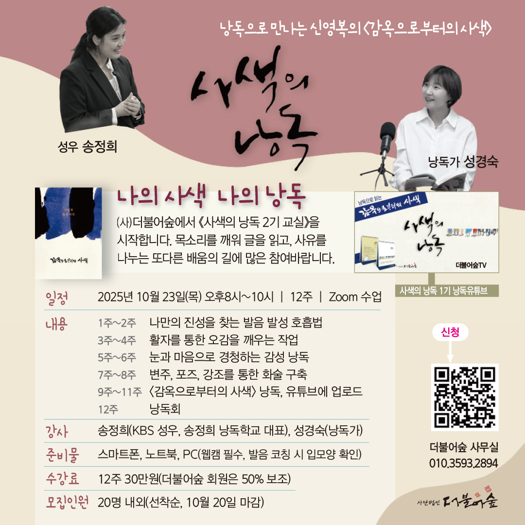신영복 아카이브 신영복 아카이브 신영복 선생님의 작품과 기록을 한 곳에 모았습니다. 계속 정돈하며 나아갈 기록 저장소입니다. 소식지 通 소식지 通 <내가 만난 신영복>사람이 보이는, 사람을 만나는 통通이 되고자 합니다. 후원회원 안내 후원회원 안내 더불어숲 운영의 기본적인 물적, 인적 토대를 마련하고 신영복 사상을 오래, 넓게, 깊게 공부하기 위한 만남과 실천의 토대를 만들기 위하여 회원 가입 및 후원을 기다립니다. 아트샵 ARTSHOP 신영복 선생님께서 남기신 글씨, 서화 등을 액자, 달력, 엽서 등으로 만나실 수 있습니다. Oct 14 2025 더불어숲학당 ‘사색의 낭독’ 2기 수강생 모집 ■ 목소리로 만나는 신영복, '사색의 낭독' 2기 수강생 모집 ■ - 사색의 낭독 1기, 함께해서 더 깊어진 '나의 낭독, 나의 사색' 더불어숲은 회원들과 함께 『감옥으로부터의... Read More Sep 29 2025 [더불어숲 낭독팀] ‘감옥으로부터의 사색’ 첫 번째 낭독회 <사단법인 더불어숲이 주최하고 송정희 낭독학교가 함께하는 첫 번째 낭독회에 여러분을 초대합니다.> 목소리에 신영복선생님의 사유를 담고, 나의 사유를 얹는 경험.... Read More Sep 29 2025 2026년 신영복서화달력 단체구매 선예약안내 (사)더불어숲 사무국 입니다. 2026년도는 故신영복 선생님께서 돌아가신 지 10주기가 되는 해입니다. 탁상형 달력은 기존의 서화 대신 <감옥으로부터의 사색> 엽서... Read More Sep 29 2025 2026년 신영복 서화달력 선예약판매 (사)더불어숲에서는 2026년 선생님 10주기를 맞아 <신영복 서화달력>을 새롭게 준비하고 있습니다. 탁상달력은 <감옥으로부터의 사색> 엽서 원본으로... Read More Sep 04 2025 명화와 함께 읽는 신영복 사단법인 더불어숲에서 2025년 하반기 정기 강좌 『명화로 함께 읽는 신영복』를 진행합니다. 신영복 선생님은 그림이 언어의 경직된 논리를 부드럽게 해주고 또한 그림 그 자체가... Read More Sep 01 2025 함께 가면 길이 된다 – 배기표의 달리기 ◇ 더불어숲 공간 마련을 위한 마중물, 100km 러닝 챌린지 : 더불어숲 회원이며 이사인 "배기표"님이 달립니다! - 9월 20일 - ◇ 1m에 1원을 후원, 완주시... Read More Jun 17 2025 [더불어 낭독팀 모집] 사색의 낭독 신영복 선생님의 <감옥으로부터의 사색> 중 "여름징역살이" 를 직접 읽어주시는 선생님의 목소리입니다. 귀로 들으니 눈으로 읽을 때와는 또 다른 감동이 느껴지지... Read More Apr 07 2025 [더불어숲학당] 신영복의 <강의> 함께 읽기 "고전을 읽는 것은 과거와 현재의 대화이면서 동시에 미래와의 대화입니다." 더불어숲학당에서 신영복의 <강의> 함께 읽기를 시작합니다. 많은 관심과... Read More 샘터찬물 more [샘터찬물 457번째 편지] 자본주의를 보는 인식의 시작점 -정연경 20...[샘터찬물 456번째 편지] 어느 고등학생의 질문 - 배기표 2025. ...[샘터찬물 455번째 편지] 사랑의 비약 -서석빈 2025.10.03[샘터찬물 453번째 편지] 유수봉하해(流水逢河海) 허 병철 2025....[샘터찬물 451번째 편지] 관계의 조직 - 심은희 (2025.09.05... 활동 | 소식 more [2026년 달력]신영복 엽서달력 탁상형과 서화달력 벽걸이형 시안[마중물] 작은숲 마중물의 모임 모습[붓글씨학당]신영복체 강좌[총회풍경] 2025년 더불어숲 제9차 정기총회2025년 더불어숲 정기총회 nodong T사랑방 logo-dol