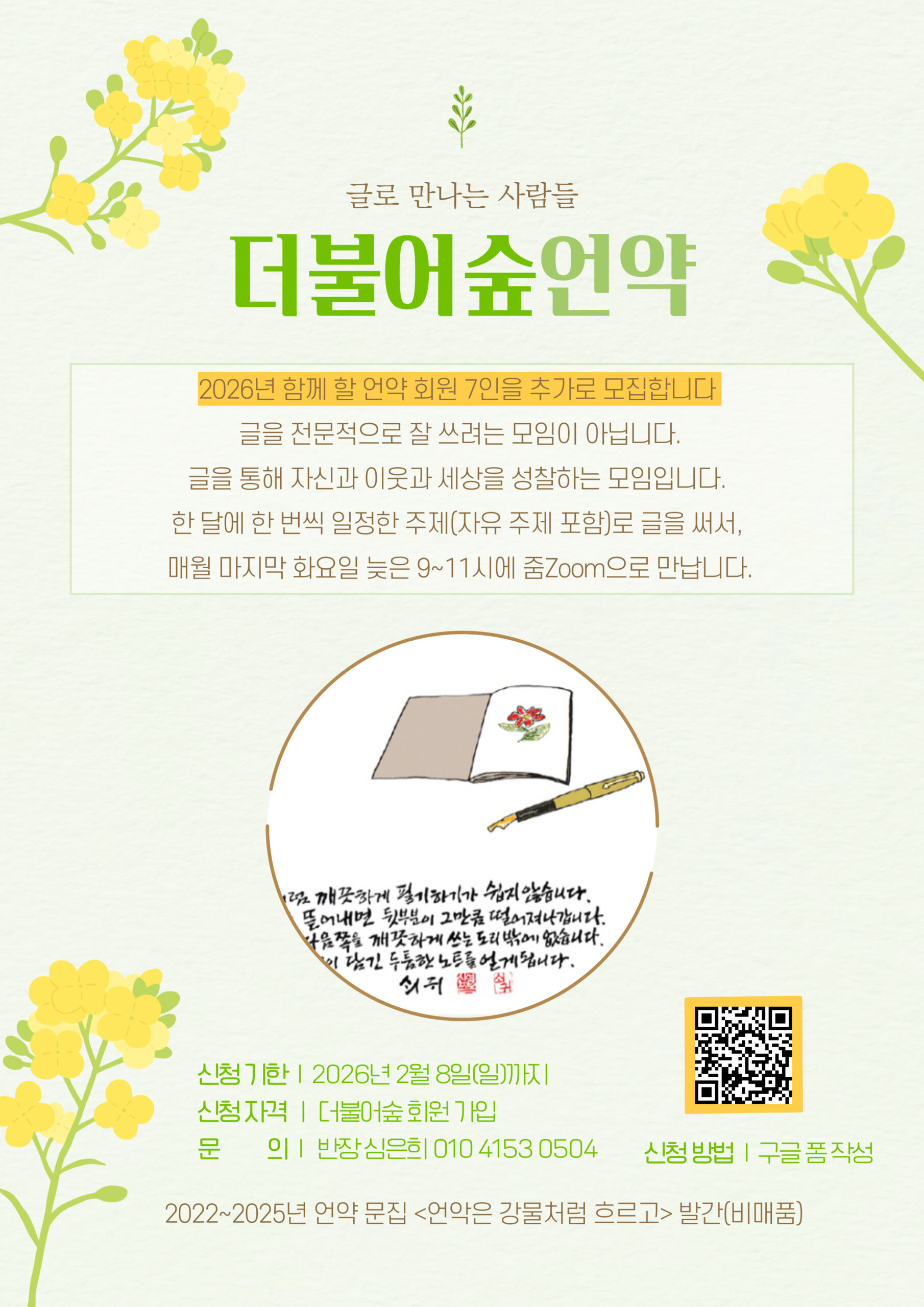 신영복 아카이브 신영복 아카이브 신영복 선생님의 작품과 기록을 한 곳에 모았습니다. 계속 정돈하며 나아갈 기록 저장소입니다. 소식지 通 소식지 通 <내가 만난 신영복>사람이 보이는, 사람을 만나는 통通이 되고자 합니다. 후원회원 안내 후원회원 안내 더불어숲 운영의 기본적인 물적, 인적 토대를 마련하고 신영복 사상을 오래, 넓게, 깊게 공부하기 위한 만남과 실천의 토대를 만들기 위하여 회원 가입 및 후원을 기다립니다. 아트샵 ARTSHOP 신영복 선생님께서 남기신 글씨, 서화 등을 액자, 달력, 엽서 등으로 만나실 수 있습니다. Jan 30 2026 신영복 선생 서거 10주기 추모 북콘서트 안내 신영복 선생 서거 10주기 추모 북콘서트 <변방에서, 다시 처음처럼> 변방에서 다시 ‘처음처럼’을 묻는 시간. 신영복 선생의 사유와 음악이 만나는 북콘서트에... Read More Jan 22 2026 2026 서여회 신입회원 모집 2026 서여회 신입회원 모집 사)더불어숲의 작은 모임 ‘서여회’에서 신영복 선생님의 붓글씨를 배울 2026년 신입 회원을 모집합니다. 서예는 몰라도 되나, 신영복 선생님의 책... Read More Jan 22 2026 2026 더불어숲 ‘언약’ 다섯 번째 회원 모집 2026 더불어숲 ‘언약’ 다섯 번째 회원 모집 언약言約은 2013년에 만들어진 (사)더불어숲의 작은숲입니다. 2026년 함께 할 언약 회원 7인을 추가로 모집합니다.... Read More Jan 19 2026 우이 신영복 서거 10주기 합동전시회 2026년은 신영복 선생 서거 10주년이 되는 해입니다. 이에 (사)더불어숲의 산하 붓글씨모임인 <서여회>는 인사동 ‘갤러리 인사아트’에서 <다시 만나는... Read More Jan 13 2026 신영복 선생 10주기 한글 서예전 신영복선생님 서거 10주기 추모주간에 더불어숲의 작은숲 “서여회”에서 준비한 전시 소식 전해드립니다. ‘한글로 만나는’ 한글 서예 전시회 ‘새봄처럼, 처음처럼’ 신영복10주기... Read More Dec 30 2025 신영복선생 10주기 추모식 및 행사 안내 [故신영복선생님 10주기 추모식 참가신청 안내(~1.15)] 선생이 별세하신 지 어느덧 10년이 지났습니다. 지난 10년 간 우리는 여러 차례의 굴곡을 겪었고, 다시 새로운... Read More Dec 16 2025 2026 신영복 서화달력 판매마감 2026 신영복 서화 달력 판매를 12월 15일(월)부로 마감합니다. 신영복 서화달력에 함께 해 주시고 성원해 주셔서 감사합니다. 신영복 서화달력과 함께 행복하고 희망 가득한... Read More Nov 04 2025 2026년 신영복 서화달력 판매안내 (사)더불어숲에서는 2026년 선생님 10주기를 맞아 <신영복 서화달력>을 새롭게 준비했습니다. 탁상달력은 <감옥으로부터의 사색> 엽서 원본으로... Read More 샘터찬물 more [샘터찬물 469번째 편지] 첫 대화 - 김한식 2026. 01. 30...[샘터찬물 468번째 편지] 신영복 선생님 10주기 추모 설교 - 성공회...[샘터찬물 467번째 편지] 세모(歲暮)에 읽는 ‘고목(古木) 명목(名木...[샘터찬물 466번째 편지] 한울삶 2025. 12. 19.[샘터찬물 465번째 편지] 관계성을 다시 생각함 - 허병철 2025. ... 활동 | 소식 more [10주기 추모] 항동푸른도서관 신영복 10주기 특별전 안내[2026년 달력]신영복 엽서달력 탁상형과 서화달력 벽걸이형 시안[마중물] 작은숲 마중물의 모임 모습[붓글씨학당]신영복체 강좌[총회풍경] 2025년 더불어숲 제9차 정기총회 nodong T사랑방 logo-dol