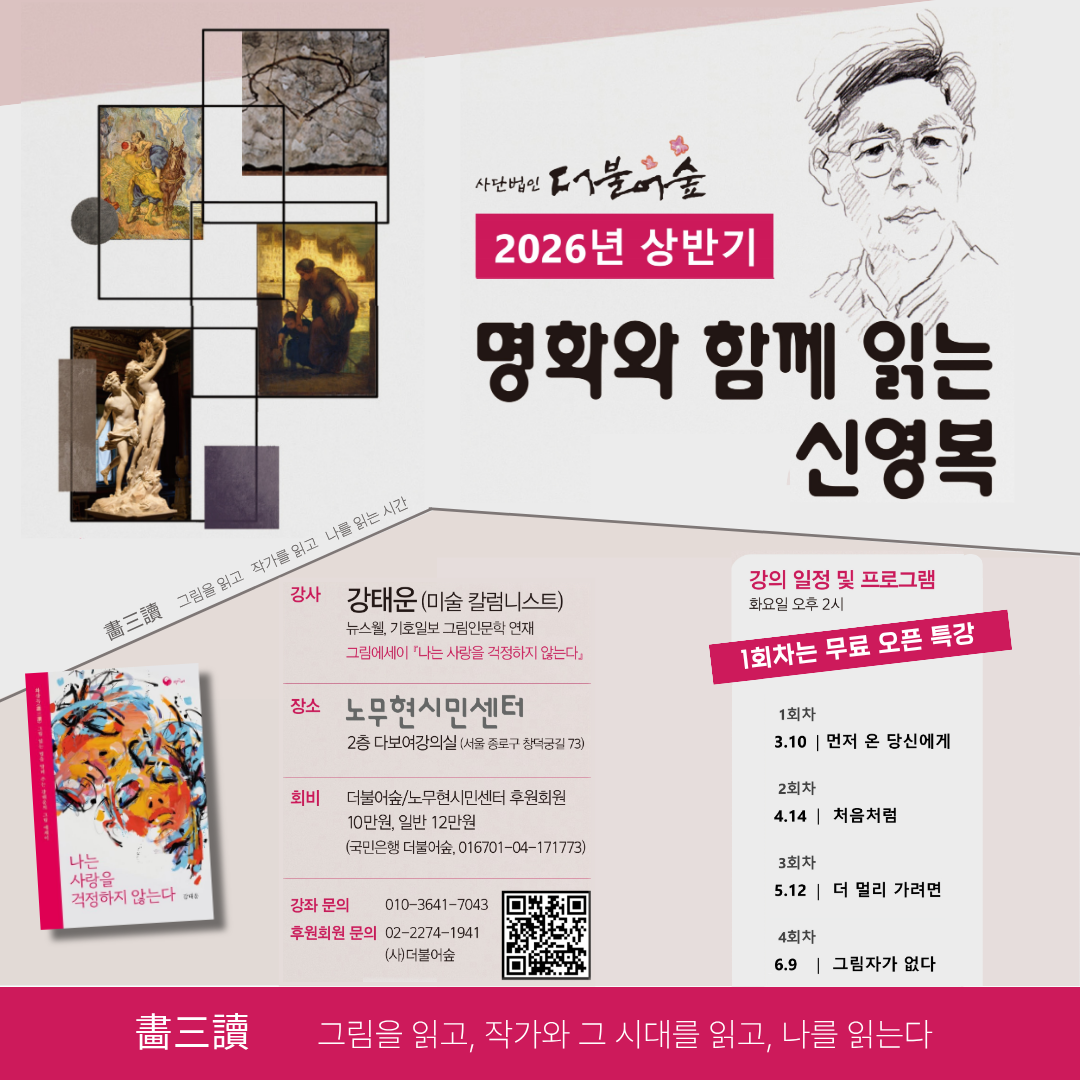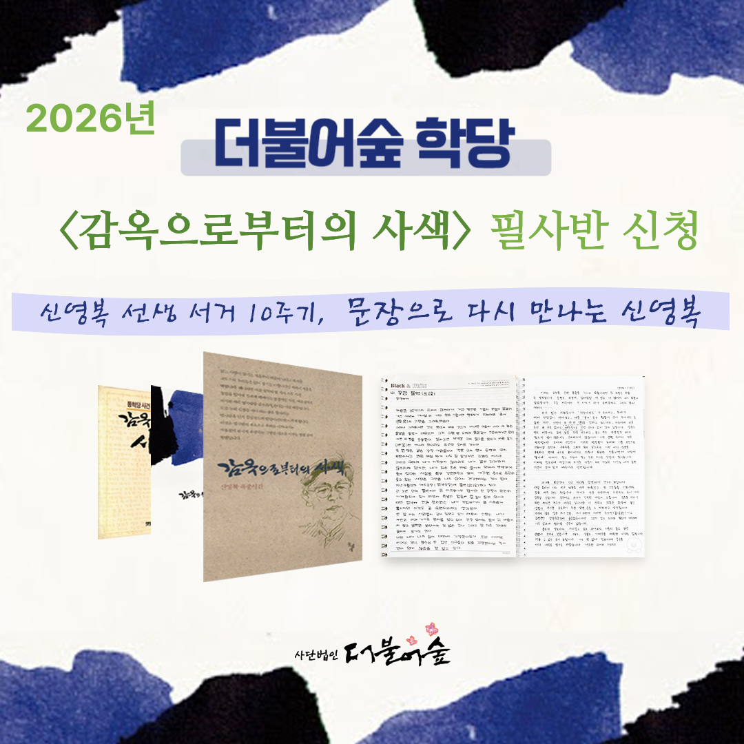신영복 아카이브 신영복 아카이브 신영복 선생님의 작품과 기록을 한 곳에 모았습니다. 계속 정돈하며 나아갈 기록 저장소입니다. 소식지 通 소식지 通 <내가 만난 신영복>사람이 보이는, 사람을 만나는 통通이 되고자 합니다. 후원회원 안내 후원회원 안내 더불어숲 운영의 기본적인 물적, 인적 토대를 마련하고 신영복 사상을 오래, 넓게, 깊게 공부하기 위한 만남과 실천의 토대를 만들기 위하여 회원 가입 및 후원을 기다립니다. 아트샵 ARTSHOP 신영복 선생님께서 남기신 글씨, 서화 등을 액자, 달력, 엽서 등으로 만나실 수 있습니다. Feb 15 2026 [모집] 2026 더불어숲학당 『명화와 함께 읽는 신영복』 수강생 모집 사단법인 더불어숲에서 2026년 상반기 정기 강좌 『명화와 함께 읽는 신영복』을 진행합니다. 신영복 선생님은 그림이 언어의 경직된 논리를 부드럽게 해주고 또한 그림 그 자체가... Read More Feb 14 2026 2026 더불어숲학당 「감옥으로부터의 사색」 필사과정 참가자 모집 2026 더불어숲학당 「감옥으로부터의 사색」 필사과정 참가자 모집 2026년 더불어숲학당의 필사과정을 2월 23일 시작합니다. 올해는 신영복선생이 우리 곁을 떠나신지 10년이... Read More Jan 30 2026 신영복 선생 서거 10주기 추모 북콘서트 안내 신영복 선생 서거 10주기 추모 북콘서트 <변방에서, 다시 처음처럼> 변방에서 다시 ‘처음처럼’을 묻는 시간. 신영복 선생의 사유와 음악이 만나는 북콘서트에... Read More Jan 22 2026 2026 서여회 신입회원 모집 2026 서여회 신입회원 모집 사)더불어숲의 작은 모임 ‘서여회’에서 신영복 선생님의 붓글씨를 배울 2026년 신입 회원을 모집합니다. 서예는 몰라도 되나, 신영복 선생님의 책... Read More Jan 22 2026 2026 더불어숲 ‘언약’ 다섯 번째 회원 모집 2026 더불어숲 ‘언약’ 다섯 번째 회원 모집 언약言約은 2013년에 만들어진 (사)더불어숲의 작은숲입니다. 2026년 함께 할 언약 회원 7인을 추가로 모집합니다.... Read More Jan 19 2026 우이 신영복 서거 10주기 합동전시회 2026년은 신영복 선생 서거 10주년이 되는 해입니다. 이에 (사)더불어숲의 산하 붓글씨모임인 <서여회>는 인사동 ‘갤러리 인사아트’에서 <다시 만나는... Read More Jan 13 2026 신영복 선생 10주기 한글 서예전 신영복선생님 서거 10주기 추모주간에 더불어숲의 작은숲 “서여회”에서 준비한 전시 소식 전해드립니다. ‘한글로 만나는’ 한글 서예 전시회 ‘새봄처럼, 처음처럼’ 신영복10주기... Read More Dec 30 2025 신영복선생 10주기 추모식 및 행사 안내 [故신영복선생님 10주기 추모식 참가신청 안내(~1.15)] 선생이 별세하신 지 어느덧 10년이 지났습니다. 지난 10년 간 우리는 여러 차례의 굴곡을 겪었고, 다시 새로운... Read More 샘터찬물 more [샘터찬물 470번째 편지] ‘우등’의 본질 - 서기용 2026. 02...[샘터찬물 469번째 편지] 첫 대화 - 김한식 2026. 01. 30...[샘터찬물 468번째 편지] 신영복 선생님 10주기 추모 설교 - 성공회...[샘터찬물 467번째 편지] 세모(歲暮)에 읽는 ‘고목(古木) 명목(名木...[샘터찬물 466번째 편지] 한울삶 2025. 12. 19. 활동 | 소식 more [10주기 추모] 항동푸른도서관 신영복 10주기 특별전 안내[2026년 달력]신영복 엽서달력 탁상형과 서화달력 벽걸이형 시안[마중물] 작은숲 마중물의 모임 모습[붓글씨학당]신영복체 강좌[총회풍경] 2025년 더불어숲 제9차 정기총회 nodong T사랑방 logo-dol