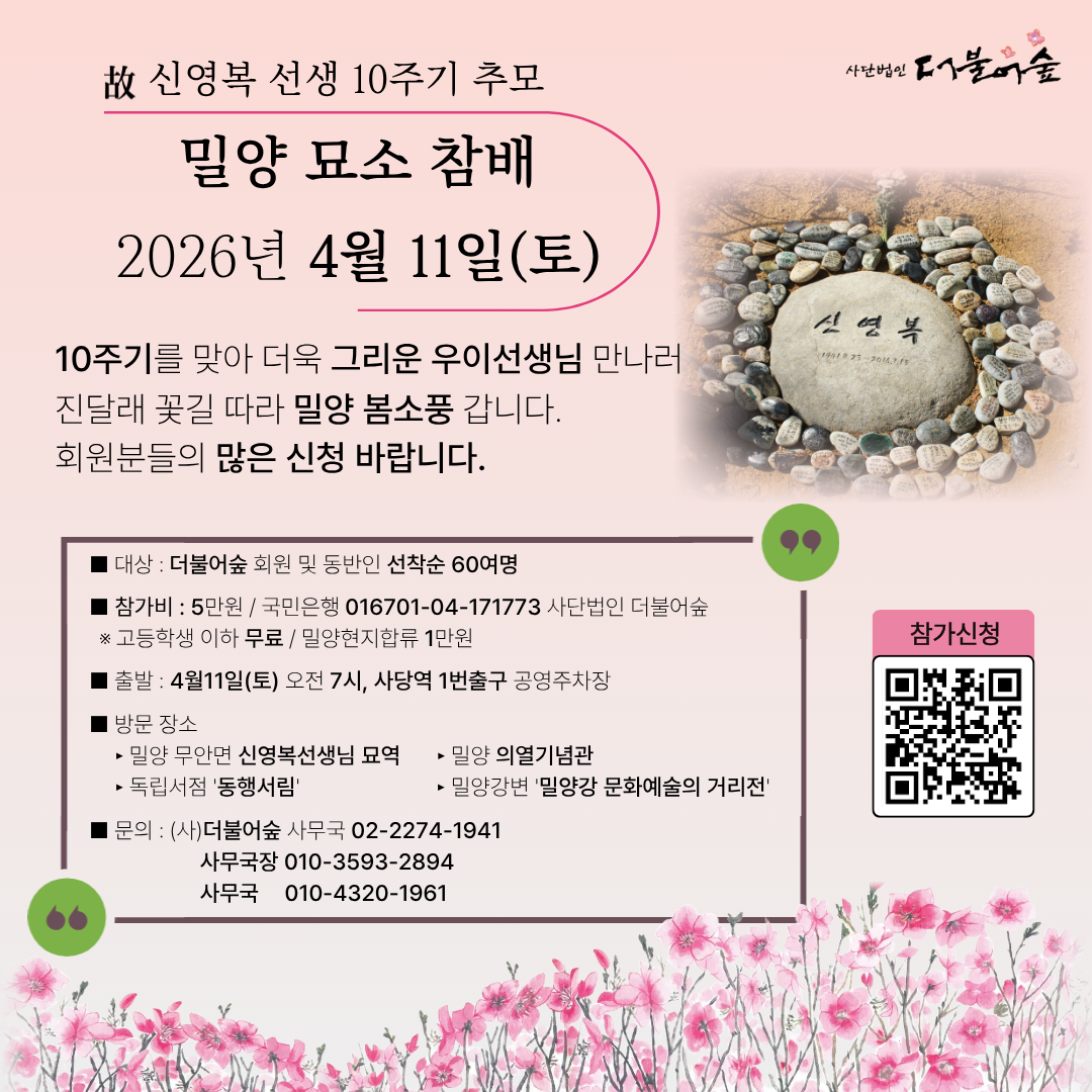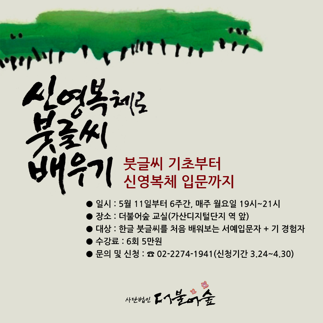신영복 아카이브 신영복 아카이브 신영복 선생님의 작품과 기록을 한 곳에 모았습니다. 계속 정돈하며 나아갈 기록 저장소입니다. 소식지 通 소식지 通 <내가 만난 신영복>사람이 보이는, 사람을 만나는 통通이 되고자 합니다. 후원회원 안내 후원회원 안내 더불어숲 운영의 기본적인 물적, 인적 토대를 마련하고 신영복 사상을 오래, 넓게, 깊게 공부하기 위한 만남과 실천의 토대를 만들기 위하여 회원 가입 및 후원을 기다립니다. 아트샵 ARTSHOP 신영복 선생님께서 남기신 글씨, 서화 등을 액자, 달력, 엽서 등으로 만나실 수 있습니다. Mar 20 2026 [모집] 신영복체 붓글씨 입문과정 안내 신영복체 붓글씨 입문과정 안내 🟥 붓글씨 기초부터 신영복체 입문까지.. 본 프로그램은 <더불어숲 학당>의 다양한 시민 교양 프로그램의 하나인 한글 붓글씨... Read More Mar 20 2026 [공지]신영복선생 10주기 추모 밀양 묘소 참배 <더불어숲 밀양 봄소풍> 안내 10주기를 맞아 더욱 그리운 우이선생님 만나러 밀양소풍 갑니다. 회원분들의 많은 신청 바랍니다. ■ 일시 :... Read More Mar 11 2026 [공지] 신영복선생 10주기 추모 북콘서트 안내 – 고창서점마을 신영복선생 10주기 추모 북콘서트 안내 - 고창서점마을 토요살롱 02 신영복 선생 10주기 추모 북콘서트 "변방에서, 다시 처음처럼" 신영복 선생의 사유와 음악이 만나는 추모의... Read More Feb 15 2026 [모집] 2026 더불어숲학당 『명화와 함께 읽는 신영복』 수강생 모집 사단법인 더불어숲에서 2026년 상반기 정기 강좌 『명화와 함께 읽는 신영복』을 진행합니다. 신영복 선생님은 그림이 언어의 경직된 논리를 부드럽게 해주고 또한 그림 그 자체가... Read More Feb 14 2026 2026 더불어숲학당 「감옥으로부터의 사색」 필사과정 참가자 모집 2026 더불어숲학당 「감옥으로부터의 사색」 필사과정 참가자 모집 2026년 더불어숲학당의 필사과정을 2월 23일 시작합니다. 올해는 신영복선생이 우리 곁을 떠나신지 10년이... Read More Jan 30 2026 신영복 선생 서거 10주기 추모 북콘서트 안내 신영복 선생 서거 10주기 추모 북콘서트 <변방에서, 다시 처음처럼> 변방에서 다시 ‘처음처럼’을 묻는 시간. 신영복 선생의 사유와 음악이 만나는 북콘서트에... Read More Jan 22 2026 2026 서여회 신입회원 모집 2026 서여회 신입회원 모집 사)더불어숲의 작은 모임 ‘서여회’에서 신영복 선생님의 붓글씨를 배울 2026년 신입 회원을 모집합니다. 서예는 몰라도 되나, 신영복 선생님의 책... Read More Jan 22 2026 2026 더불어숲 ‘언약’ 다섯 번째 회원 모집 2026 더불어숲 ‘언약’ 다섯 번째 회원 모집 언약言約은 2013년에 만들어진 (사)더불어숲의 작은숲입니다. 2026년 함께 할 언약 회원 7인을 추가로 모집합니다.... Read More 샘터찬물 more [샘터찬물 475번째 편지] 산천의 봄, 세상의 봄 - 사무국 202...[샘터찬물 475번째 편지] 산천의 봄, 세상의 봄 - 사무국 2026....[샘터찬물 474번째 편지] 봄의 길목에서, ‘평화의 춤’을 꿈꾸며 -...[샘터찬물 473번째 편지] 서도와 필재(筆才), 그리고 서여회 -최훈 ...[샘터찬물 472번째 편지] 신독(愼獨)을 위함 -이도환 2026. 02... 활동 | 소식 more [10주기 추모] 항동푸른도서관 신영복 10주기 특별전 안내[2026년 달력]신영복 엽서달력 탁상형과 서화달력 벽걸이형 시안[마중물] 작은숲 마중물의 모임 모습[붓글씨학당]신영복체 강좌[총회풍경] 2025년 더불어숲 제9차 정기총회 nodong T사랑방 logo-dol