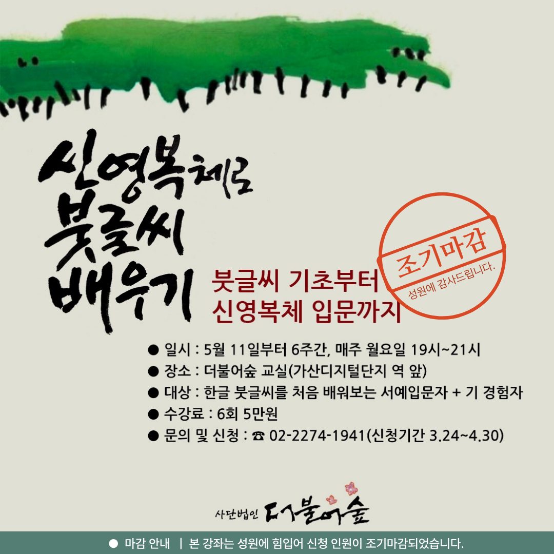 신영복 아카이브 신영복 아카이브 신영복 선생님의 작품과 기록을 한 곳에 모았습니다. 계속 정돈하며 나아갈 기록 저장소입니다. 소식지 通 소식지 通 <내가 만난 신영복>사람이 보이는, 사람을 만나는 통通이 되고자 합니다. 후원회원 안내 후원회원 안내 더불어숲 운영의 기본적인 물적, 인적 토대를 마련하고 신영복 사상을 오래, 넓게, 깊게 공부하기 위한 만남과 실천의 토대를 만들기 위하여 회원 가입 및 후원을 기다립니다. 아트샵 ARTSHOP 신영복 선생님께서 남기신 글씨, 서화 등을 액자, 달력, 엽서 등으로 만나실 수 있습니다. Apr 18 2026 [행사후기] 2026년 더불어숲 밀양 봄소풍 소식 [행사후기] 2026년 더불어숲 밀양 봄소풍 소식 안녕하세요, 지난 4월11일(토) 전국에서 모이신 여러 회원분들과 함께 밀양 봄소풍 무사히 다녀왔습니다. 올해는 특히... Read More Apr 01 2026 [모집] 더불어숲학당 펜드로잉 강좌 수강생 모집 [펜으로 떠나는 여행드로잉] 수강생 모집 2026년 새롭게 시작되는 더불어숲학당의 드로잉 강좌에 함께 하실 분들을 기다립니다. 펜으로 떠나는 여행드로잉 ... Read More Mar 31 2026 [공지] 2026년 (사)더불어숲 제10차 정기총회 결과보고 2026년 (사)더불어숲 제10차 정기총회 결과보고 2026년 (사)더불어숲 정기총회를 잘 마쳤습니다. 반가운 회원분들과 얼굴 마주하며 소식 전할 수 있어 귀한... Read More Mar 20 2026 [모집] 신영복체 붓글씨 입문과정 안내 신영복체 붓글씨 입문과정 안내 🟥 붓글씨 기초부터 신영복체 입문까지.. 본 프로그램은 <더불어숲 학당>의 다양한 시민 교양 프로그램의 하나인 한글 붓글씨... Read More Mar 20 2026 [공지]신영복선생 10주기 추모 밀양 묘소 참배 <더불어숲 밀양 봄소풍> 안내 10주기를 맞아 더욱 그리운 우이선생님 만나러 밀양소풍 갑니다. 회원분들의 많은 신청 바랍니다. ■ 일시 :... Read More Mar 11 2026 [공지] 신영복선생 10주기 추모 북콘서트 안내 – 고창서점마을 신영복선생 10주기 추모 북콘서트 안내 - 고창서점마을 토요살롱 02 신영복 선생 10주기 추모 북콘서트 "변방에서, 다시 처음처럼" 신영복 선생의 사유와 음악이 만나는 추모의... Read More Feb 15 2026 [모집] 2026 더불어숲학당 『명화와 함께 읽는 신영복』 수강생 모집 사단법인 더불어숲에서 2026년 상반기 정기 강좌 『명화와 함께 읽는 신영복』을 진행합니다. 신영복 선생님은 그림이 언어의 경직된 논리를 부드럽게 해주고 또한 그림 그 자체가... Read More Feb 14 2026 2026 더불어숲학당 「감옥으로부터의 사색」 필사과정 참가자 모집 2026 더불어숲학당 「감옥으로부터의 사색」 필사과정 참가자 모집 2026년 더불어숲학당의 필사과정을 2월 23일 시작합니다. 올해는 신영복선생이 우리 곁을 떠나신지 10년이... Read More 샘터찬물 more [샘터찬물 480번째 편지] 차가운 땅도 생명을 품고 - 조희연 2026...[샘터찬물 479번째 편지] 선(善)의 본질 - 서기용 2026. 04....[샘터찬물 479번째 편지] 선(善)의 본질 - 서기용 2026. 04....[샘터찬물 478번째 편지] 이란이 있어 참 다행이다 -정연경 2026....[샘터찬물 477번째 편지] 함께 맞는 비 - 김한식 2026. 03. ... 활동 | 소식 more [10주기 추모] 항동푸른도서관 신영복 10주기 특별전 안내[2026년 달력]신영복 엽서달력 탁상형과 서화달력 벽걸이형 시안[마중물] 작은숲 마중물의 모임 모습[붓글씨학당]신영복체 강좌[총회풍경] 2025년 더불어숲 제9차 정기총회 nodong T사랑방 logo-dol