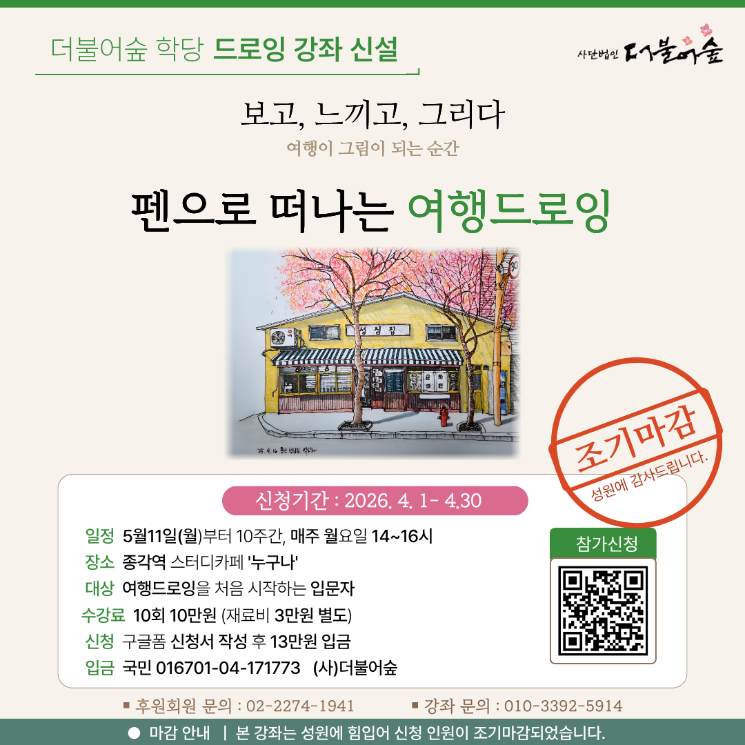 신영복 아카이브 신영복 아카이브 신영복 선생님의 작품과 기록을 한 곳에 모았습니다. 계속 정돈하며 나아갈 기록 저장소입니다. 소식지 通 소식지 通 <내가 만난 신영복>사람이 보이는, 사람을 만나는 통通이 되고자 합니다. 후원회원 안내 후원회원 안내 더불어숲 운영의 기본적인 물적, 인적 토대를 마련하고 신영복 사상을 오래, 넓게, 깊게 공부하기 위한 만남과 실천의 토대를 만들기 위하여 회원 가입 및 후원을 기다립니다. 아트샵 ARTSHOP 신영복 선생님께서 남기신 글씨, 서화 등을 액자, 달력, 엽서 등으로 만나실 수 있습니다. Apr 18 2026 [행사후기] 2026년 더불어숲 밀양 봄소풍 소식 [행사후기] 2026년 더불어숲 밀양 봄소풍 소식 안녕하세요, 지난 4월11일(토) 전국에서 모이신 여러 회원분들과 함께 밀양 봄소풍 무사히 다녀왔습니다. 올해는 특히... Read More Apr 01 2026 [마감] 더불어숲학당 펜드로잉 강좌 수강생 모집 [펜으로 떠나는 여행드로잉] 신청 마감 2026년 새롭게 시작되는 더불어숲학당의 드로잉 강좌가 조기마감되었습니다. 성원에 감사드립니다. 펜으로 떠나는 여행드로잉 ... Read More Mar 31 2026 [공지] 2026년 (사)더불어숲 제10차 정기총회 결과보고 2026년 (사)더불어숲 제10차 정기총회 결과보고 2026년 (사)더불어숲 정기총회를 잘 마쳤습니다. 반가운 회원분들과 얼굴 마주하며 소식 전할 수 있어 귀한... Read More Mar 20 2026 [마감] 신영복체 붓글씨 입문과정 [마감] 신영복체 붓글씨 입문과정 🟥 붓글씨 기초부터 신영복체 입문까지.. [마감] 상반기 과정은 조기마감되었습니다. 성원에 감사드립니다. 본 프로그램은 <더불어숲... Read More Mar 20 2026 [공지]신영복선생 10주기 추모 밀양 묘소 참배 <더불어숲 밀양 봄소풍> 안내 10주기를 맞아 더욱 그리운 우이선생님 만나러 밀양소풍 갑니다. 회원분들의 많은 신청 바랍니다. ■ 일시 :... Read More Mar 11 2026 [공지] 신영복선생 10주기 추모 북콘서트 안내 – 고창서점마을 신영복선생 10주기 추모 북콘서트 안내 - 고창서점마을 토요살롱 02 신영복 선생 10주기 추모 북콘서트 "변방에서, 다시 처음처럼" 신영복 선생의 사유와 음악이 만나는 추모의... Read More Feb 15 2026 [모집] 2026 더불어숲학당 『명화와 함께 읽는 신영복』 수강생 모집 사단법인 더불어숲에서 2026년 상반기 정기 강좌 『명화와 함께 읽는 신영복』을 진행합니다. 신영복 선생님은 그림이 언어의 경직된 논리를 부드럽게 해주고 또한 그림 그 자체가... Read More Feb 14 2026 2026 더불어숲학당 「감옥으로부터의 사색」 필사과정 참가자 모집 2026 더불어숲학당 「감옥으로부터의 사색」 필사과정 참가자 모집 2026년 더불어숲학당의 필사과정을 2월 23일 시작합니다. 올해는 신영복선생이 우리 곁을 떠나신지 10년이... Read More 샘터찬물 more [샘터찬물 480번째 편지] 차가운 땅도 생명을 품고 - 조희연 2026...[샘터찬물 479번째 편지] 선(善)의 본질 - 서기용 2026. 04....[샘터찬물 479번째 편지] 선(善)의 본질 - 서기용 2026. 04....[샘터찬물 478번째 편지] 이란이 있어 참 다행이다 -정연경 2026....[샘터찬물 477번째 편지] 함께 맞는 비 - 김한식 2026. 03. ... 활동 | 소식 more [10주기 추모] 항동푸른도서관 신영복 10주기 특별전 안내[2026년 달력]신영복 엽서달력 탁상형과 서화달력 벽걸이형 시안[마중물] 작은숲 마중물의 모임 모습[붓글씨학당]신영복체 강좌[총회풍경] 2025년 더불어숲 제9차 정기총회 nodong T사랑방 logo-dol