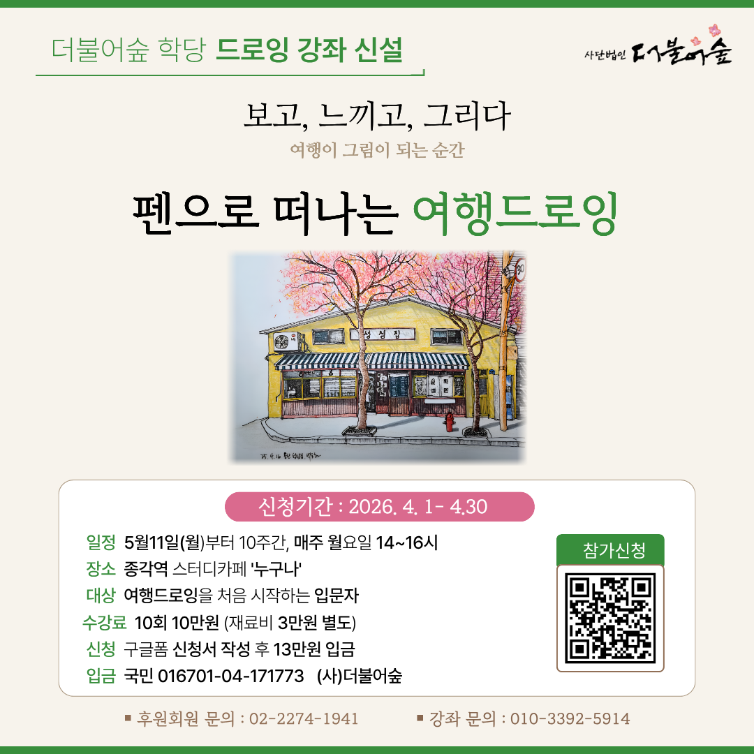 신영복 아카이브 신영복 아카이브 신영복 선생님의 작품과 기록을 한 곳에 모았습니다. 계속 정돈하며 나아갈 기록 저장소입니다. 소식지 通 소식지 通 <내가 만난 신영복>사람이 보이는, 사람을 만나는 통通이 되고자 합니다. 후원회원 안내 후원회원 안내 더불어숲 운영의 기본적인 물적, 인적 토대를 마련하고 신영복 사상을 오래, 넓게, 깊게 공부하기 위한 만남과 실천의 토대를 만들기 위하여 회원 가입 및 후원을 기다립니다. 아트샵 ARTSHOP 신영복 선생님께서 남기신 글씨, 서화 등을 액자, 달력, 엽서 등으로 만나실 수 있습니다. Apr 01 2026 [모집] 더불어숲학당 펜드로잉 강좌 수강생 모집 [펜으로 떠나는 여행드로잉] 수강생 모집 2026년 새롭게 시작되는 더불어숲학당의 드로잉 강좌에 함께 하실 분들을 기다립니다. 펜으로 떠나는 여행드로잉 ... Read More Mar 31 2026 [공지] 2026년 (사)더불어숲 제10차 정기총회 결과보고 2026년 (사)더불어숲 제10차 정기총회 결과보고 2026년 (사)더불어숲 정기총회를 잘 마쳤습니다. 반가운 회원분들과 얼굴 마주하며 소식 전할 수 있어 귀한... Read More Mar 20 2026 [모집] 신영복체 붓글씨 입문과정 안내 신영복체 붓글씨 입문과정 안내 🟥 붓글씨 기초부터 신영복체 입문까지.. 본 프로그램은 <더불어숲 학당>의 다양한 시민 교양 프로그램의 하나인 한글 붓글씨... Read More Mar 20 2026 [공지]신영복선생 10주기 추모 밀양 묘소 참배 <더불어숲 밀양 봄소풍> 안내 10주기를 맞아 더욱 그리운 우이선생님 만나러 밀양소풍 갑니다. 회원분들의 많은 신청 바랍니다. ■ 일시 :... Read More Mar 11 2026 [공지] 신영복선생 10주기 추모 북콘서트 안내 – 고창서점마을 신영복선생 10주기 추모 북콘서트 안내 - 고창서점마을 토요살롱 02 신영복 선생 10주기 추모 북콘서트 "변방에서, 다시 처음처럼" 신영복 선생의 사유와 음악이 만나는 추모의... Read More Feb 15 2026 [모집] 2026 더불어숲학당 『명화와 함께 읽는 신영복』 수강생 모집 사단법인 더불어숲에서 2026년 상반기 정기 강좌 『명화와 함께 읽는 신영복』을 진행합니다. 신영복 선생님은 그림이 언어의 경직된 논리를 부드럽게 해주고 또한 그림 그 자체가... Read More Feb 14 2026 2026 더불어숲학당 「감옥으로부터의 사색」 필사과정 참가자 모집 2026 더불어숲학당 「감옥으로부터의 사색」 필사과정 참가자 모집 2026년 더불어숲학당의 필사과정을 2월 23일 시작합니다. 올해는 신영복선생이 우리 곁을 떠나신지 10년이... Read More Jan 30 2026 신영복 선생 서거 10주기 추모 북콘서트 안내 신영복 선생 서거 10주기 추모 북콘서트 <변방에서, 다시 처음처럼> 변방에서 다시 ‘처음처럼’을 묻는 시간. 신영복 선생의 사유와 음악이 만나는 북콘서트에... Read More 샘터찬물 more [샘터찬물 478번째 편지] 이란이 있어 참 다행이다 -정연경 2026.... [샘터찬물 477번째 편지] 함께 맞는 비 - 김한식 2026. 03. ...[샘터찬물 476번째 편지] 변화의 유니폼 -허병철 2026. 03. ... [샘터찬물 475번째 편지] 산천의 봄, 세상의 봄 - 사무국 202...[샘터찬물 475번째 편지] 산천의 봄, 세상의 봄 - 사무국 2026.... 활동 | 소식 more [10주기 추모] 항동푸른도서관 신영복 10주기 특별전 안내[2026년 달력]신영복 엽서달력 탁상형과 서화달력 벽걸이형 시안[마중물] 작은숲 마중물의 모임 모습[붓글씨학당]신영복체 강좌[총회풍경] 2025년 더불어숲 제9차 정기총회 nodong T사랑방 logo-dol