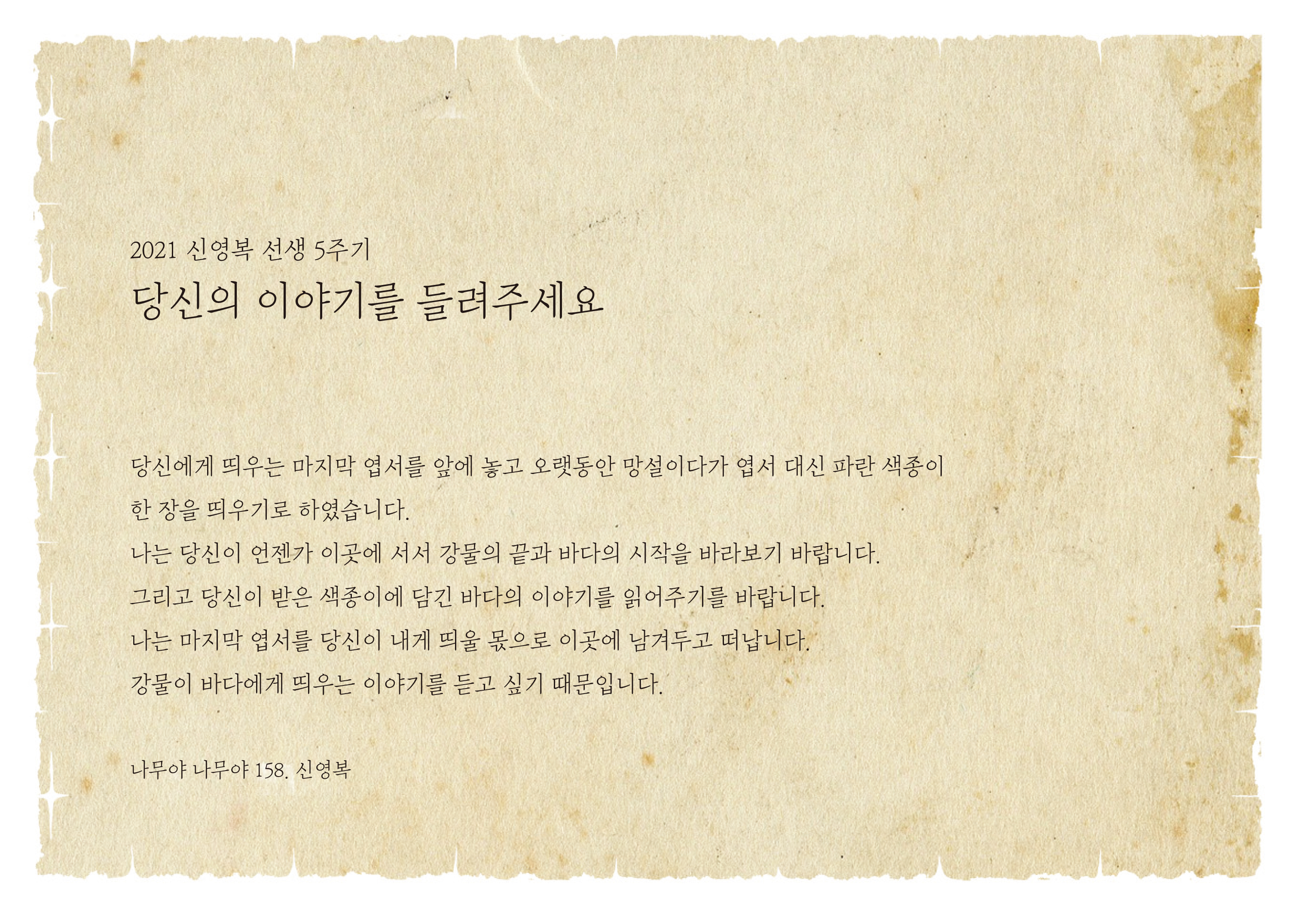 글보기제목프린터 출력용_엽서견본3_pdf파일 다운받기2020-12-30 19:53작성자더불어숲첨부파일신영복선생 5주기 엽서3.pdf (539.9KB)신영복선생 5주기 엽서3_2.jpg (314.1KB)태그 목록 이전컴퓨터입력용_엽서견본3_hwp파일 다운받기더불어숲2020-12-30다음컴퓨터 입력용_엽서견본2_hwp파일 다운받기더불어숲2020-12-30 Powered by MangBoard | 망보드 스토어