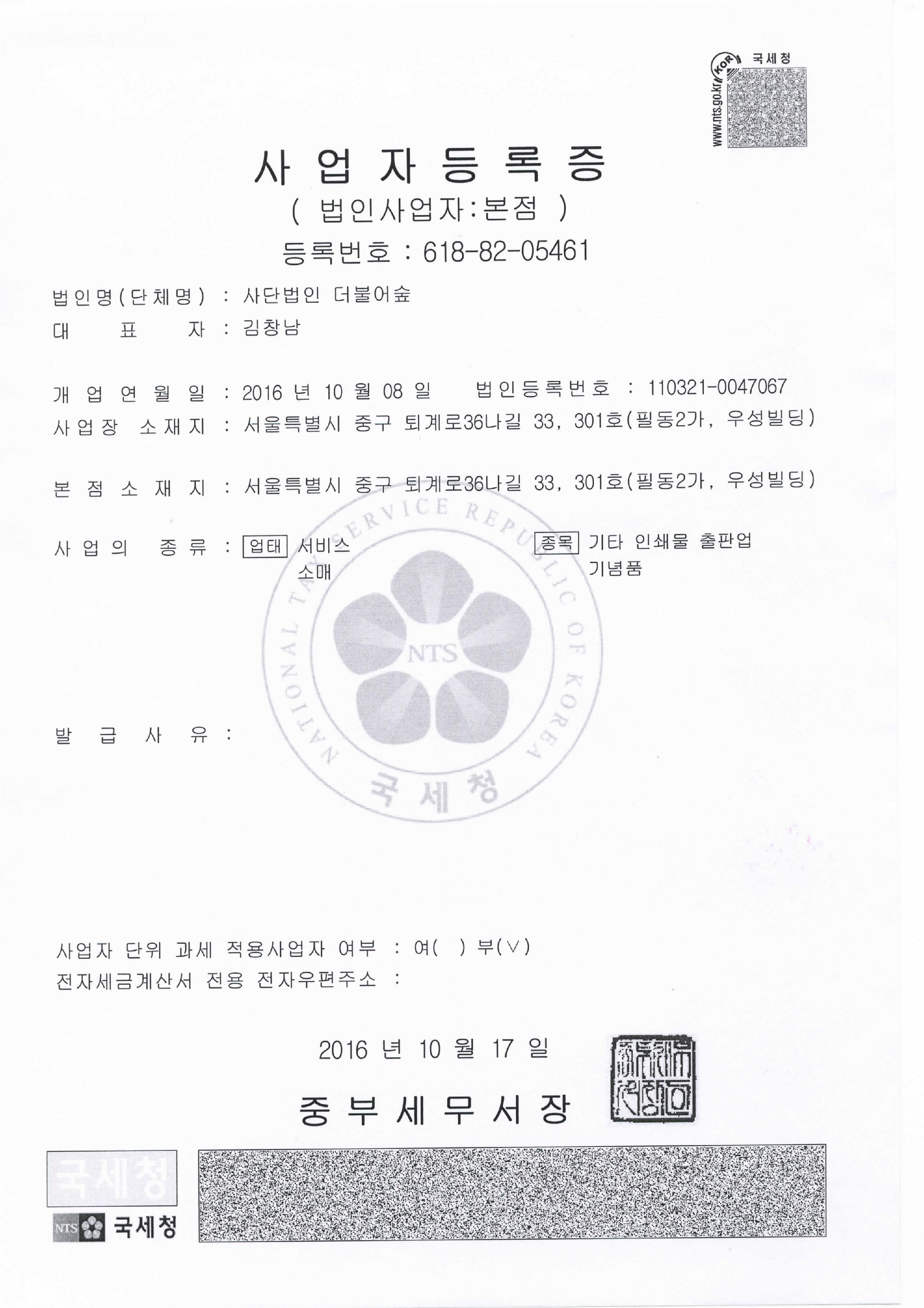 글보기제목(사)더불어숲 사업자등록증2016-12-01 13:36작성자유용훈태그 목록 이전(사) 더불어숲 정기총회 위임장 양식파일더불어숲2017-05-03다음(사)더불어숲 회원가입신청서유용훈2016-11-17 Powered by MangBoard | 망보드 스토어
