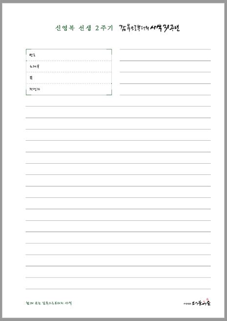 글보기제목2주기 추모전시회에서 사용한 필사노트 파일입니다2018-01-23 17:35작성자더불어숲첨부파일필사노트_오른쪽.pdf (90.4KB)필사노트_왼쪽.pdf (90.9KB)신영복선생님 2주기 추모전시회장에서 진행된 "감옥으로부터의 사색" 필사 이어가기 때 사용했던 필사노트의 파일입니다.출력하여 자신만의 필사노트를 만들어보시기 바랍니다. 제본 위치 왼쪽으로 설정되어 있으며, 양면인쇄가 가능하도록 오른쪽, 왼쪽이 구분되어 있습니다. 태그 목록 이전Shin, Young-Bok (영문 약력)더불어숲2018-01-24다음(사) 더불어숲 정기총회 위임장 양식파일더불어숲2017-05-03 Powered by MangBoard | 망보드 스토어