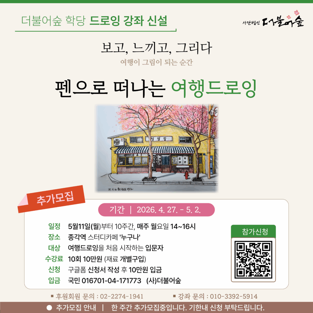 2026년 새롭게 시작되는 더불어숲학당의 드로잉 강좌가 조기마감되었습니다. 성원에 감사드립니다.