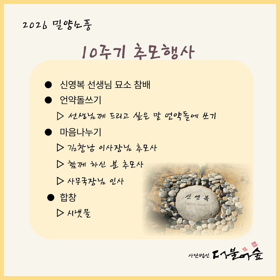 올해는 특히 신영복선생님 10주기를 맞이한 해라 우리에게 더욱 깊은 울림을 주는 시간이었습니다. 바쁜 일정 중에도 귀한 시간 내어주신 회원님들과 동행해주신 가족, 지인분들께 감사의 인사 드립니다.