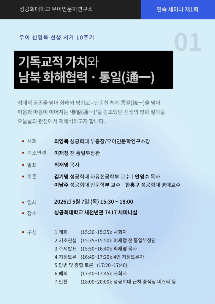 제1회 세미나 주제는 <기독교적 가치와 남북화해협력과 통일>입니다.