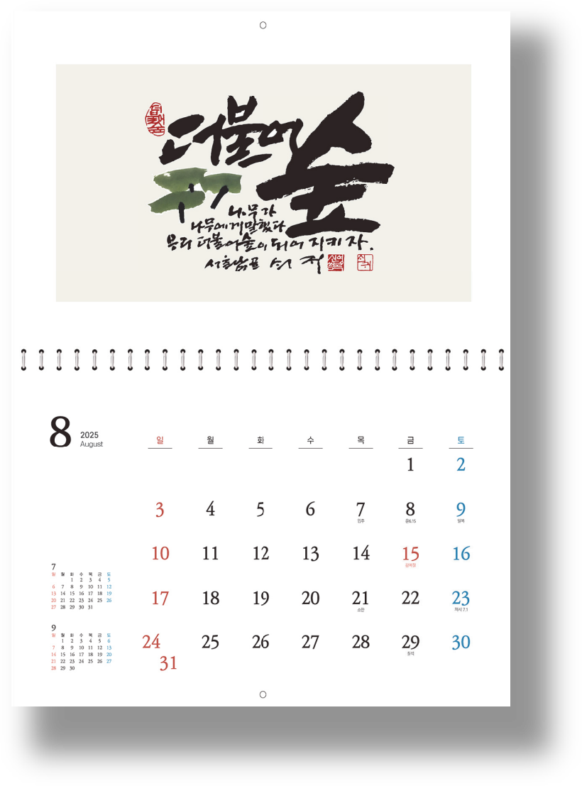 장바구니 mypage 비회원 주문조회 위시리스트 2025년 신영복 서화달력(벽걸이)글보기판매가격17,000원 배송비3,500원상품코드899수량글보기글보기글보기- 판매마감 -*달력 배송은 11월 말까지 순차적으로 진행될 예정입니다.*5만원미만 배송비 3,500원 / 5만원이상 주문시 배송비 무료*무통장 입금시입금 계좌: 국민은행 384701-04-276366 (예금주: 사단법인 더불어숲) <2025년 신영복 서화달력> 벽걸이형 달력을 소개합니다. *달력의 전체 시안은 https://forestogether.org/board?vid=159 여기서 확인하세요.^^ 댓글 [1] 댓글작성자(*)비밀번호(*)자동등록방지(자동등록방지 숫자를 순서대로 입력해 주세요)내용(*) 댓글 등록 더보기관련 상품2026 신영복 서화달력(벽걸이형) 17,000원2018신영복선생 2주기 서화전 도록 품절[후원회원용]2025년 신영복 서화달력(벽걸이)-더불어숲 정기후원회원만 주문. 판매마감[후원회원용]2025년 신영복 서화달력(탁상형)-더불어숲 정기후원회원만 주문 판매마감 Powered by MangBoard | 워드프레스 쇼핑몰 - 망보드 커머스