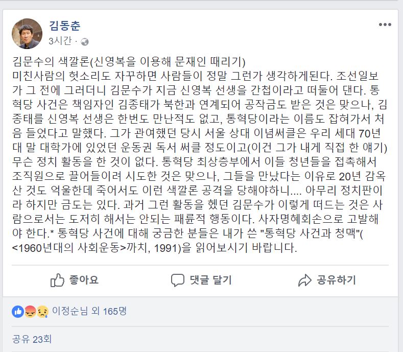 글보기제목김문수의 색깔론에 대한 김동춘교수님의 글2018-05-04 14:49작성자더불어숲평화로 가는 큰 흐름을 막으려는 자들의 억지와 왜곡이 있습니다.최근 신영복 선생님을 이용해 현 정부를 흠집내려는 김문수 후보 및 조선일보 등은 신영복 선생님에 대한 억지와 음해를 중단하고 삭제하기 바랍니다. 태그 추천(0)목록글쓰기 댓글 [0] 댓글작성자(*)비밀번호(*)자동등록방지(자동등록방지 숫자를 입력해 주세요)내용(*) 댓글 등록 더보기이전2018년도 사단법인 정기총회 및 특별강연이 열린 날 더불어숲2018-05-20다음전시회] 신영복선생님 서화특별전 "만남"더불어숲2018-05-02 Powered by MangBoard | 망보드 스토어