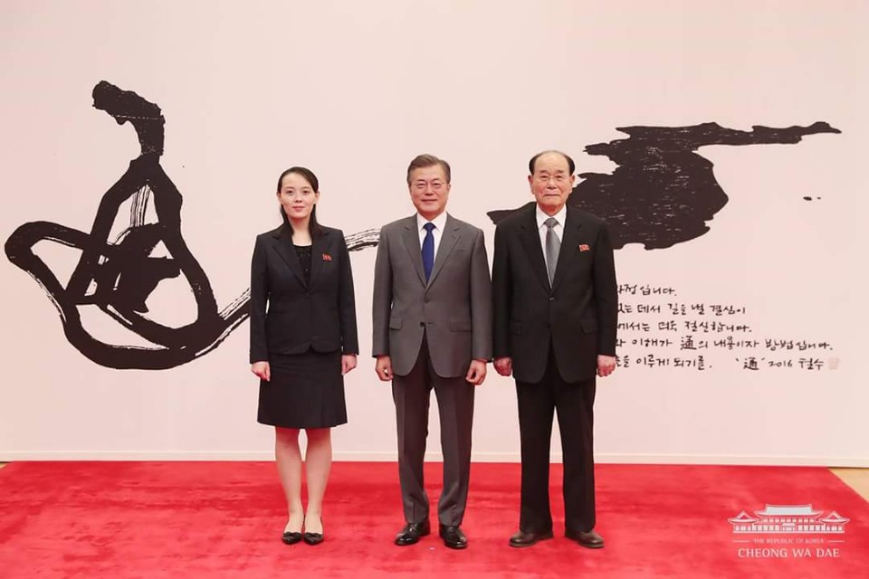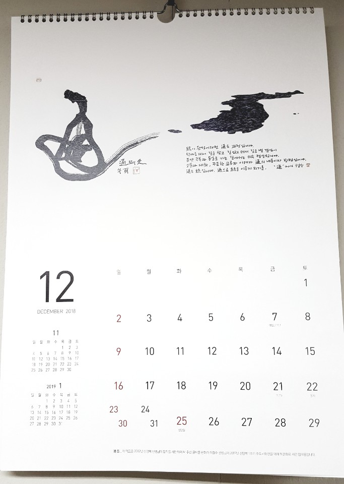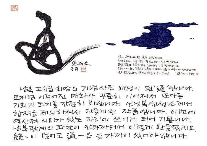 최근 문재인 대통령과 김영남최고인민회의 상임위원장,김여정부부장이 함께 찍은 사진의 배경이 된 통은 신영복선생님과 이철수 화백님의 합작품입니다. 원작품은 판화이고(크기98*40) 이 작품을 청와대에서 크게 확대하여 벽에 설치한 것입니다. 신영복선생님께서 2002년 이철수 선생님댁에 들르셨을때 합작을 제안하시고 통, 물흐르고 흘러 바다를 여백을 많이 두고 써주시고 가셨습니다. 오랜동안 완성을 못하고 숙제로 가지고 계시던 이철수선생님께서 2016년 사단법인 더불어숲의 제안으로 작업하셔서 2017년 1월 신영복선생님 1주기 서화전에 출품하신 작품입니다. 사단법인 더불어숲에서는 신영복 선생님 작품 통을 2018년 서화달력의 표지로, 이철수선생님과의 합작품 통을 12월작품으로 사용한바 있습니다.
