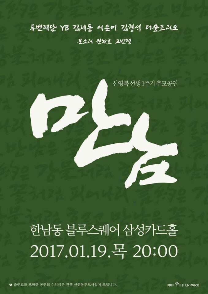 2017년 1월19일(목) 20시에 신영복 선생님 추모공연이 있습니다. 여럿이 함께 하면 기쁨은 배가 되고 슬픔은 반이 될 뿐만 아니라 기쁨도 슬픔도 큰 힘이 됩니다. 더불어 함께 만나는 기쁨은 키우고, 그리움과 슬픔은 나누는 자리가 되었으면 좋겠습니다. _ 이 공연은 선생의 생전에 함께 했던 분들의 뜻을 모아 기획되었습니다. 그의 동료이자 제자였던 성공회대 교수들로 구성된 더숲트리오, 성공회대학교 제자인 김제동, 그리고 윤도현(YB)씨와 인문학습원을 통해 인연을 맺었던 가수 이은미씨, 또 생전에 인연은 없었지만 책을 통해 선생을 알게 되었고 많은 가르침을 받았다는 작곡가 김형석씨와 두번째달이 선생을 추모하는 노래와 음악을 연주하며 영화배우 문소리씨, KBS 아나운서 고민정씨가 각자의 사연과 선생의 글귀를 낭송합니다. 공연의 연출은 성공회대 제자인 탁현민씨가 맡았으며 공연의 수익금 전액은 신영복선생추모사업기금으로 쓰여지게 됩니다. 공연의 제목은 [만남]입니다. 1주기 행사 전체의 주제이기도 한 [만남]의 의미는 일찌기 선생이 남기셨던 글귀에서 따왔습니다. 선생은 사람과 사람사이의 작은 ‘만남’이 모든 변화의 시작이라고 말씀 하셨습니다. 또한 유언으로 남기신 말씀 역시 후학들에게 만남을 이어가라고 것이었습니다. 그래서 이번 추모공연은 선생의 유지에 따라 만들어진 공연입니다. 우리 사회는 여전히 그리고 또 앞으로도 더 좋게 더 아름답게 더 살만하게 꾸준히 변화해야 하는 공간이고 그 변화를 만들기 위해 우리는 끝없이 서로 만나 함께 생각하고 이야기하고 노래해야 할 것이라고 믿습니다. 모쪼록 이 추모공연이 그러한 자리가 되길 바라는 마음입니다. |