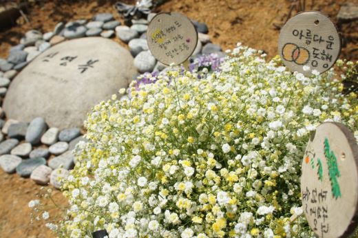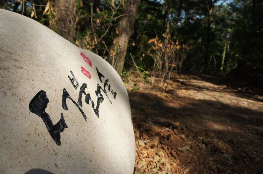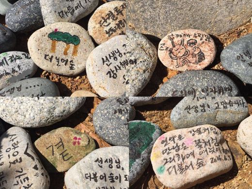 처음엔 헌화를 고민했다가 꺽인 꽃보다 조금 더 의미있는 것을 찾다가 조약돌 아이디어가 나왔습니다. 경주 사시는 서ㅇㅇ님께 소풍 전날 급작스럽게 150여개의 조약돌을 모아 가져다달라는 무리한 부탁도 흔쾌히 받아주시고, 소풍날 글씨 쓰기 좋은 크기의 이쁘고 반들반들한 조약돌을 가지고 와 주셨습니다.