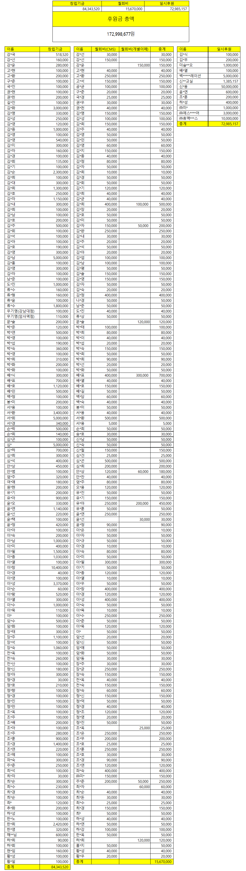 제목더불어숲 후원내역(2015.11.01~2016.11.31)2016-12-07 12:38작성자유용훈 창립기금 : 더불어숲이 창립기금을 받기 시작한 2015년 11월부터 사단법인설립허가일(2016년 6월 16일)까지 보내주신 후원금월회비 : 사단법인 설립허가일(2016년 6월16일)부터 2016년 11월 31일까지 보내주신 회비일시후원 : 사단법인 설립허가일(2016년 6월16일)부터 2016년 11월 31일까지 보내주신 일시후원금 보내주신 후원금에 감사드리며 모든 재정운영은 투명하게 공개하겠습니다.현재 온라인상에서 회원가입, 일시후원, 기부금내역조회, 기부금영수증발급이 가능한 시스템을 구축중입니다.(휴먼소프트, 12월중으로 완료)고맙습니다. 목록답변 이전[서식] 연간 기부금 모금액 및 활용실적 명세서유용훈2016-12-01다음(사)더불어숲 2016년도 사업수지예산서및 예비 사업수지결산서(2016.06.16. - 11.18.)유용훈2016-12-07 Powered by MangBoard | 망보드 스토어