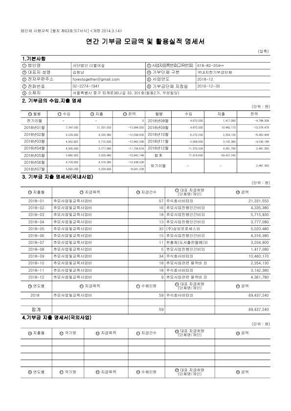 제목[2018년] 연간 기부금 모금내역및 활용실적2019-04-01 12:30작성자더불어숲첨부파일공개 보고서 기부금모금액 및 활용실적명세(2018).pdf (158.6KB) 목록답변 이전[2017년] 사단법인 더불어숲 재정공개더불어숲2018-04-03다음[2018년] 사단법인 더불어숲 재정공개더불어숲2019-04-01 Powered by MangBoard | 망보드 스토어